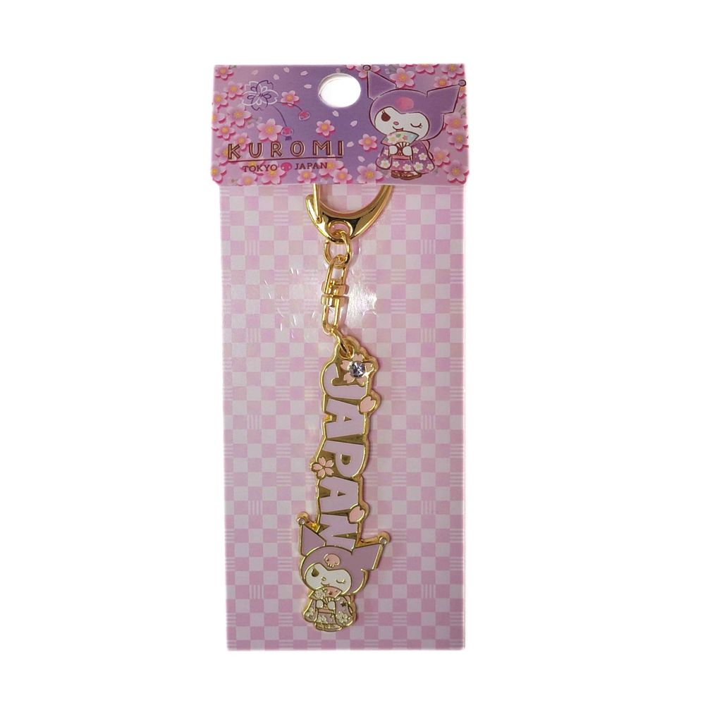 Kuromi is wearing a purple kimono in this keychain, which has sakura flowers around "Japan".