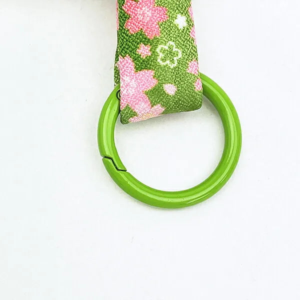 Kuromi face tag in deep red with a white face and rosy cheeks, pink skull forehead emblem, green "matcha" floral kimono bow and matching floral strap with black lace trim and green keyring